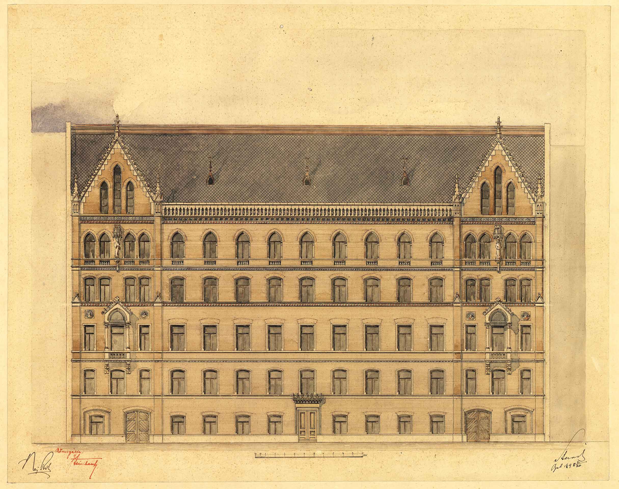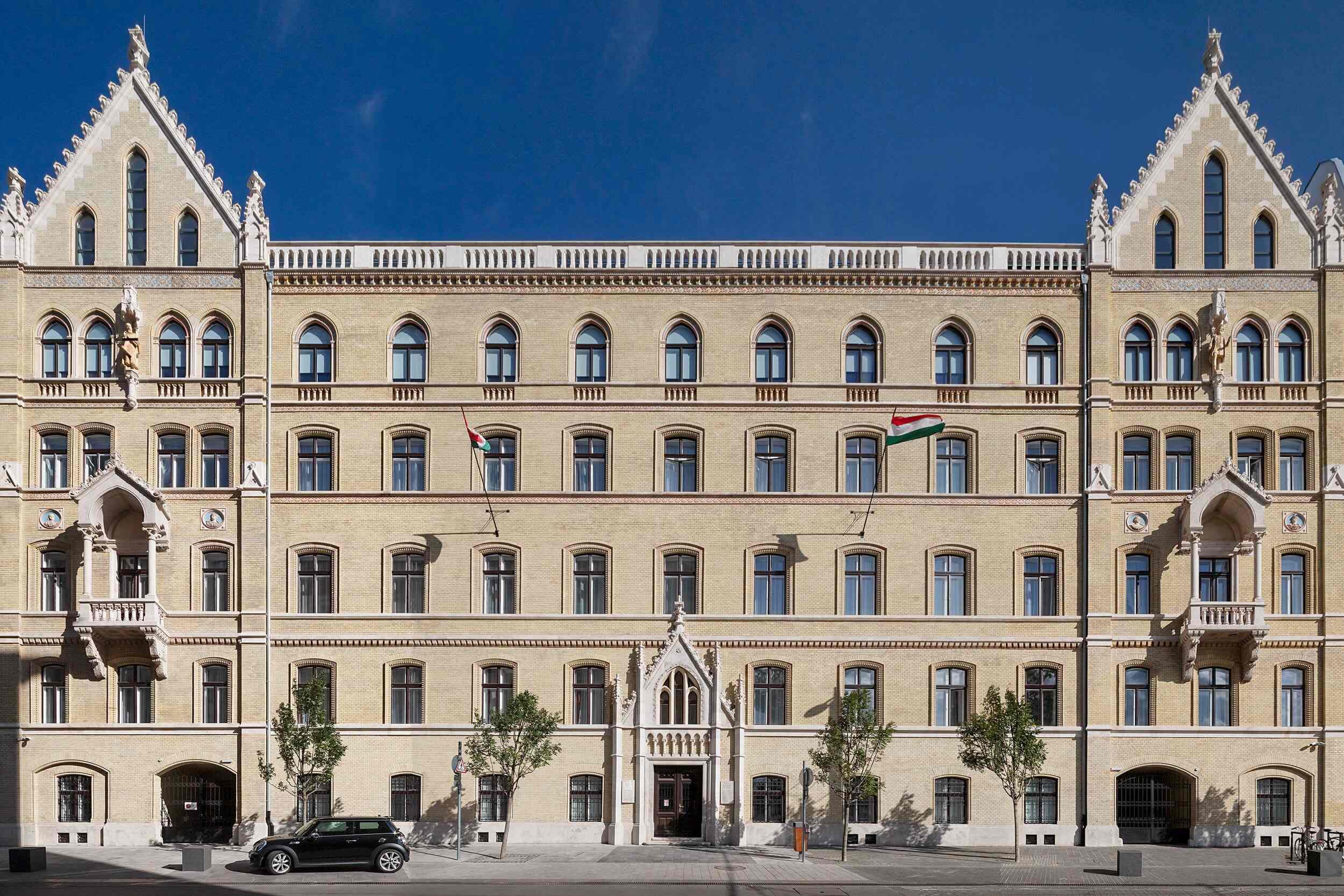 Országház tervezése során a fűtési rendszer nehéz feladat elé állította Steindlt és munkatársait. Álláspontjuk szerint a füstölgő kémények látványa és az ezzel járó rengeteg korom méltatlan lett volna a törvényhozás épületéhez, ezért végül 1896 márciusában úgy döntöttek, hogy a kazánházat a közeli Személynök – ma Balassi Bálint – utcában helyezik el. A kiszemelt telek utcai részére pedig négyemeletes bérházat emelnek, ahol az Országgyűlésben dolgozó tisztviselők számára bérlakásokat alakítanak ki. Steindl Imre terveit 1898–1899 során valósították meg az Országház építésében is résztvevő vállalkozók, ipar- és képzőművészek. A neogótikus stílusjegyeket hordozó épület utcai, téglaburkolatos homlokzata közeli rokonságot mutatott az Országház belső udvaraival. A Zsolnay kerámiabetéteknek és a baldachinos fülkékben elhelyezett allegorikus szobroknak köszönhetően míves, elegáns megjelenésű volt. A II. világháborúban az épület tetőszerkezete megsérült, majd az ostrom utáni lakásínség idején sebtében beépítették a tetőteret, eltüntetve ezzel a vimpergás oromzatokat. Egy későbbi felújítás során pedig a szobrokat és fülkéiket is eltávolították, így felszámolták az épület Országházhoz tartozását jelző építészeti megoldások, díszítések jelentős részét.